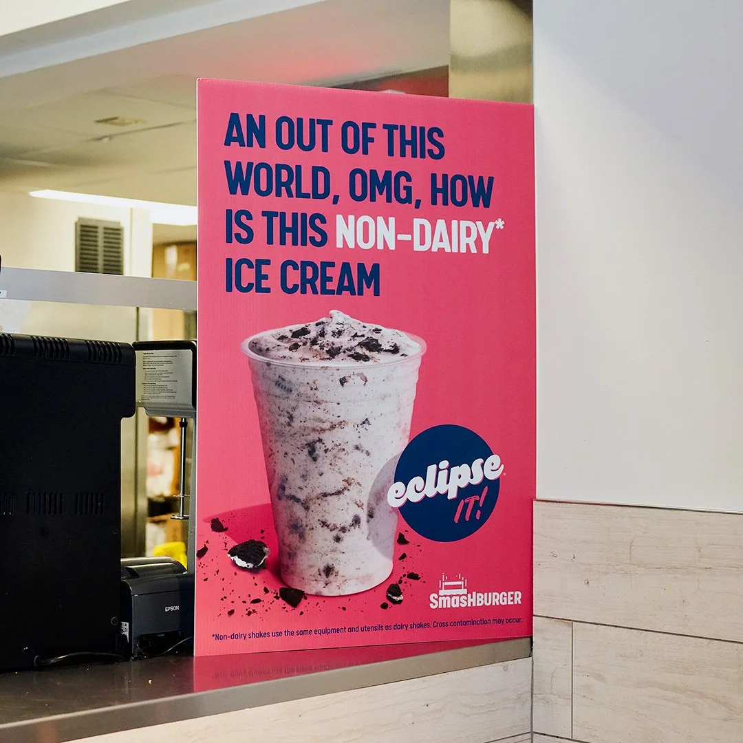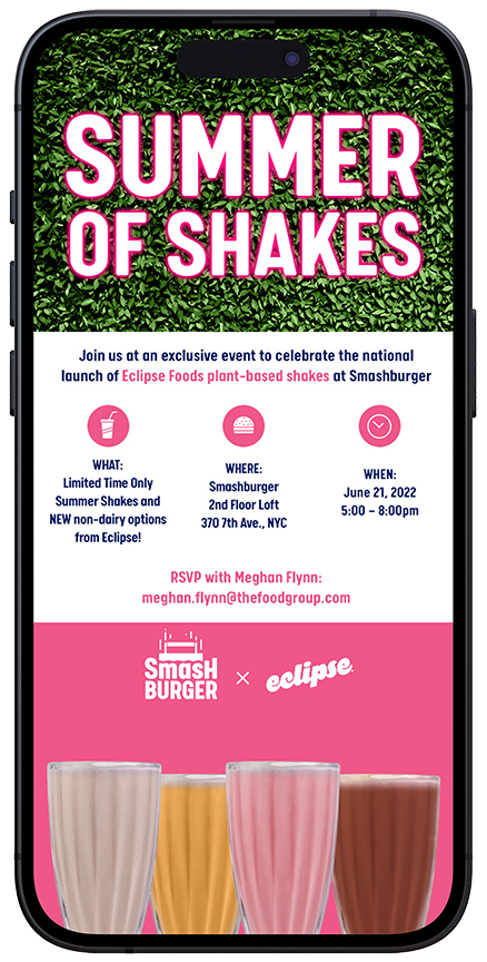 Eclipse, the non-dairy ice cream, embarked on their first major restaurant partnership and we amped the launch party. We executed a store takeover in one of Smashburger’s NYC flagship restaurants and invited influencers and the media. Multiple photo backdrops scattered the venue while all visitor touch points were encompassed with our Summer of Shakes theme. And guests left with some very cool swag bags.
